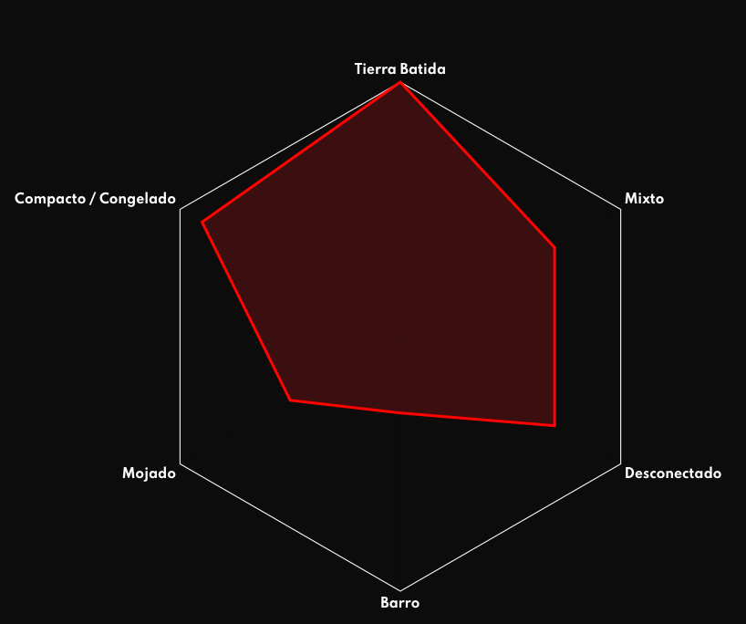 Terreno Dry cierra la brecha entre la banda de rodadura para todas las condiciones y la banda de rodadura lisa. La clave es el diseño único de "espina de pescado" angular, que permite una excelente suavidad en el medio y al mismo tiempo tracción en las frenadas y en las curvas. Los tacos laterales de la banda de rodadura más pronunciados permiten el agarre incluso en las curvas más difíciles.